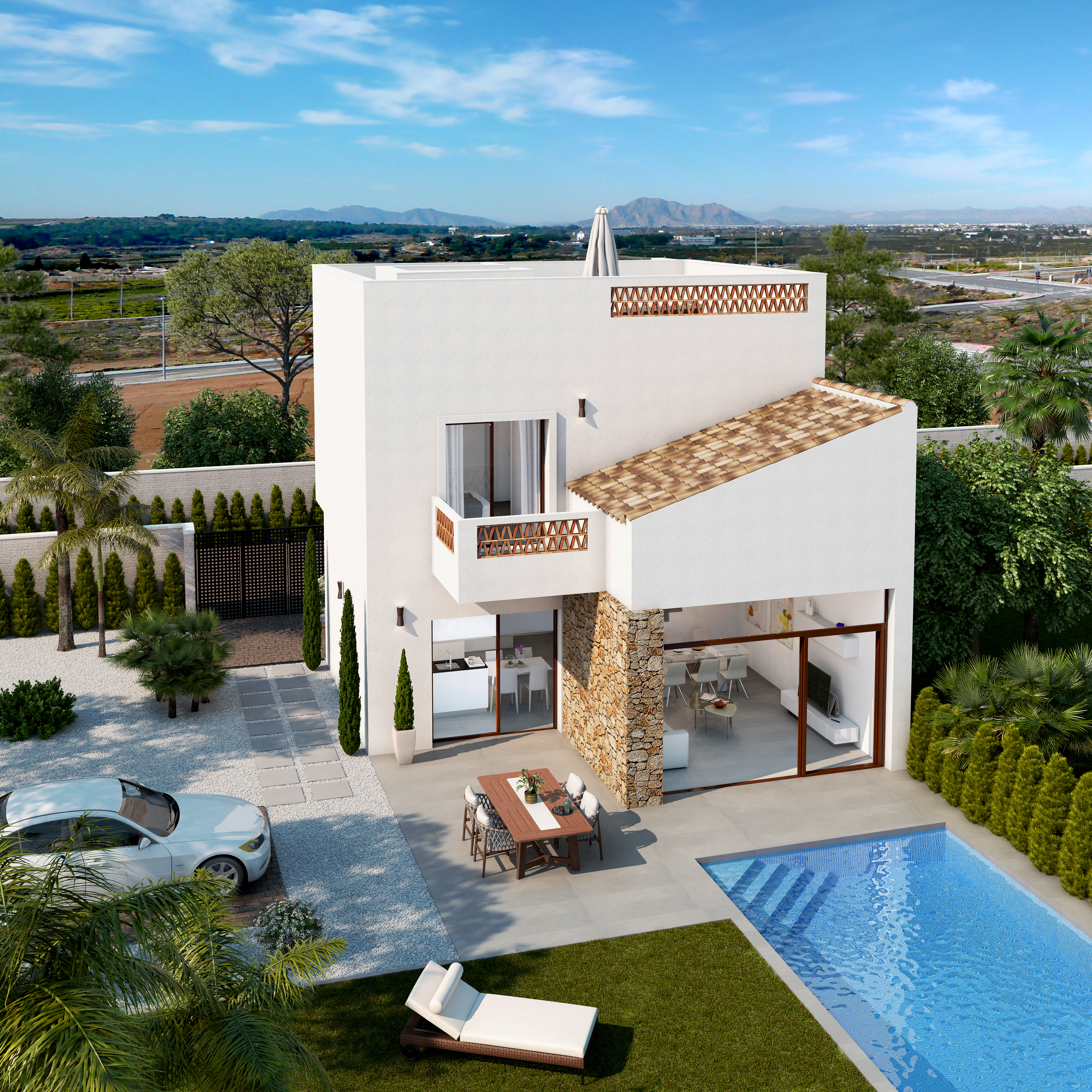 • Overview: In the typical Spanish village Benijofar these modern villas are being built. The villa stands on a plot of more than 232 m² with a capacity of 116 m², 3 large double rooms, 2 complete bathrooms, beautiful dining room with open kitchen. On the outside we find a fantastic private garden with barbecue, swimming pool (optional) parking space. Prices v.a. € 225,900 to € 339,900.
